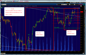 The above chart is an excellent example of this particular prinicple side by side. Observe how I have labeled the chart. The smaller wave (ii) appears to a be finished zig-zag correction and I would expect a five wave wave (iii) to be in process. We’ll wait to see what happens from here, but this appears to be a high probability trade to the downside.