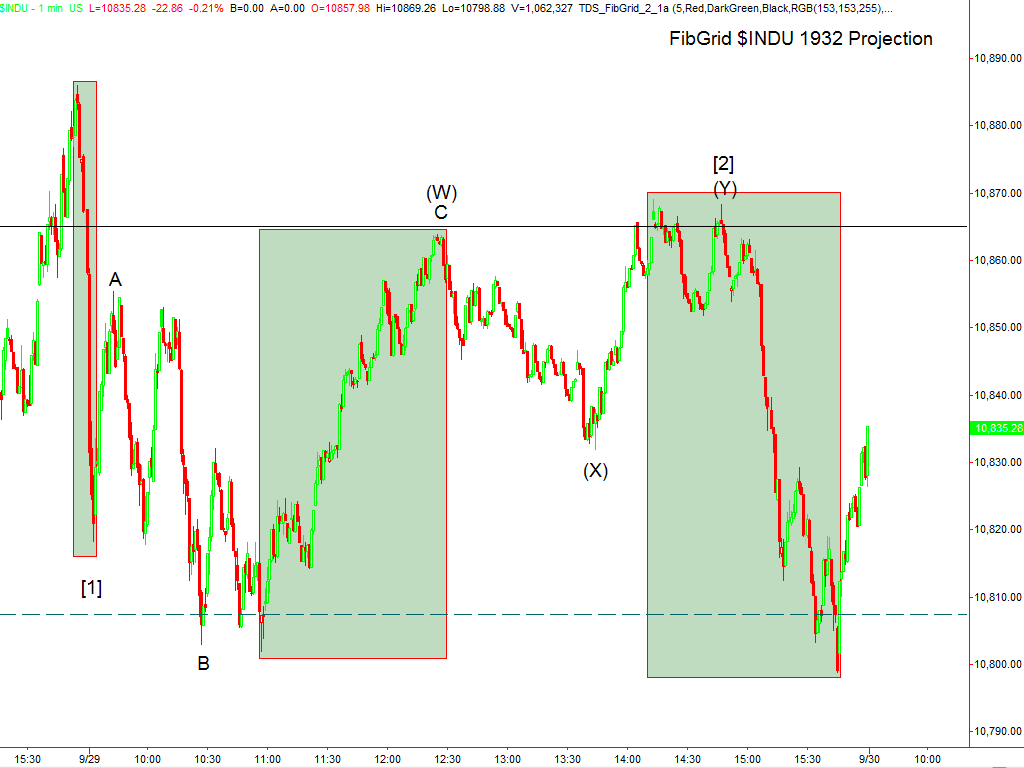 As we mentioned in our evening update, action on Wednesday did little to clarify direction. On a one minute chart we have highlighted several waves that could count out as five-wave impulses. The middle of the three is the one which causes trouble being bearish. We could have tried to to use the five waves up as the C wave in a flat correction, but we subsequently put in a higher high above that level, so if it was part of a bearish correction, then it would likely be a double zig-zag as shown. Please note, WE ARE NOT ENDORSING TRADING BASED ON THIS COUNT. It is an illustration of how one might count this as bearish. In situations like this we need to use future price action to tell us we need to find a count like this rather than seeing the possibility and trading based on it.