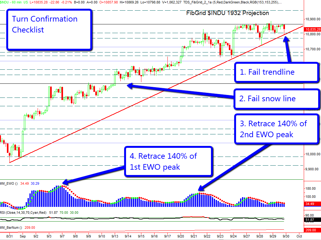 On another hourly chart, notice that we have several touches of a trendline up from August 31st lows. This level also supported the DJIA on its fall today. Since this level has now shown itself as support, one of the first things we would like to see to confirm a turn down is breaking this level and then holding below it, perhaps with a retest. It is the first in a list of things we’d like to see that will continually build confidence in a turn: