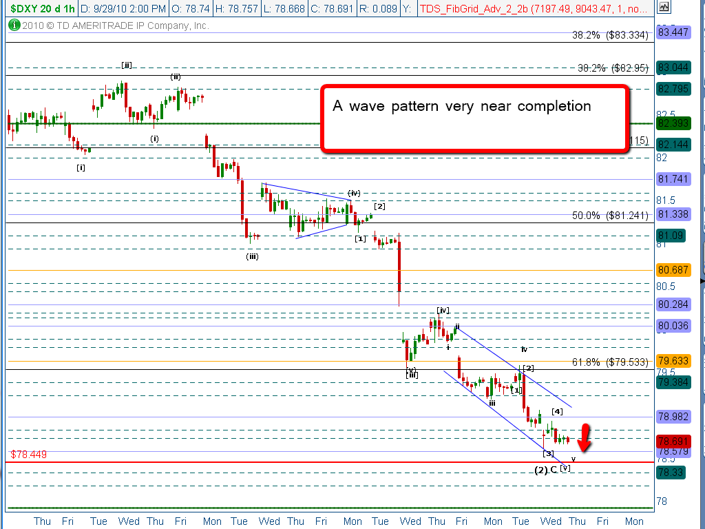 The sentiment for the dollar is very bearish at this time, everyone has thrown in the towel. In fact it is even more bearish than what it was at the December 2009 lows. This is what we most often see at wave 2 lows. Our wave count indicates that perhaps we will see just one more micro wave down to complete the pattern before the dollar turns back to the upside. With our expected completions of a turn in the equities, we expect to see the inverse move in the currencies to coincide. Today should be an interesting day.