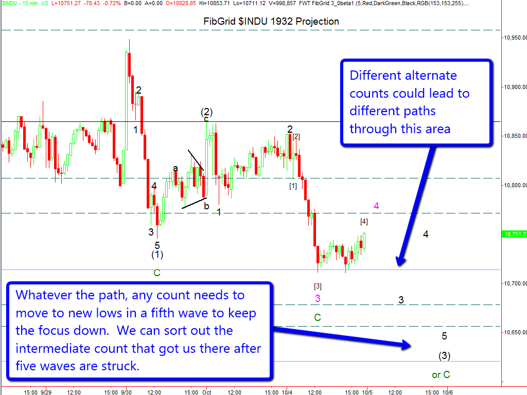 The financial media have already decided the cause of Monday’s weakness. It seems that we’re all “pacing” ourselves for earnings season and a bit nervous about Friday’s employment report. We think that the wave structure tells the story and speaks for itself. Markets were extended and ripe for a pullback, a move we are now seeing. We still need confirmation that current weakness is more than a correction. But even if corrective, it looks like it should continue at least a little more.