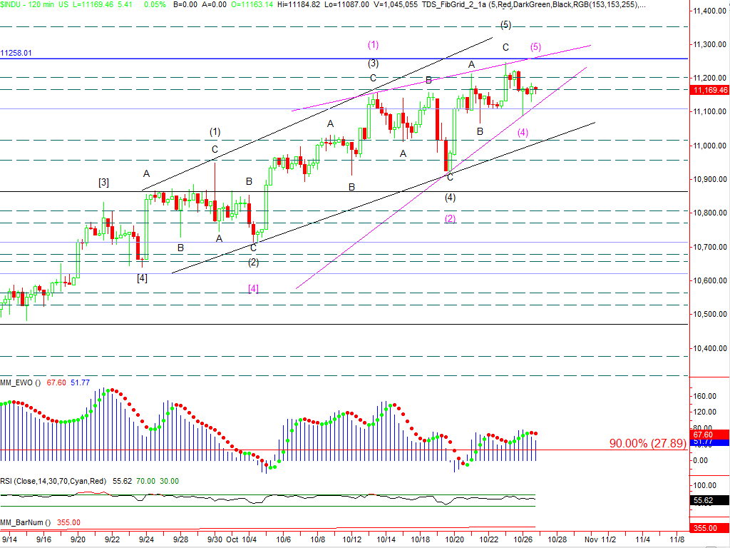 Markets remain indecisive.  We see this demonstrated by the difficulty extending to from three waves to five waves either up or down.  Weakness in the futures overnight suggests we might take out some support levels, but the current levels aren’t low enough to predict we’ll extend to five waves.  For that, traders will need to keep up the selling after the open.  This indecision has us looking at ending diagonal patterns in equities.  In Forex we see similar indecision but it has us considering a fourth wave triangle.  While both of these patterns are composed of multiple three-wave components they suggest different outlook.  If those counts represent what is actually happening then we would expect a new high in the Euro, but not in the DJIA (or at least only a minor one).  Of course, the markets could break out of this indecision with strong five-wave moves and put an end to the chop.