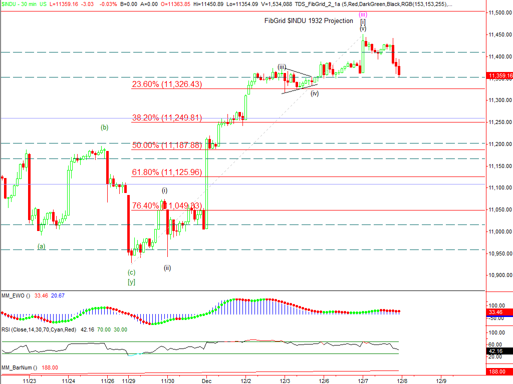 Our Fibonacci time projection date of December 8th has come and passed.  Whatever predictive power these time relationships have is also qualified by the fact that they’re rarely exact so we can give a few days leeway, but we didn’t put much stock into it to begin with.  The DJIA did not put in a new high yesterday so it could not turn on the projected date.  However, the S&P 500 did slightly exceed its November high.  That raises the possibility that the S&P 500 completed five waves up on Tuesday and has turned.