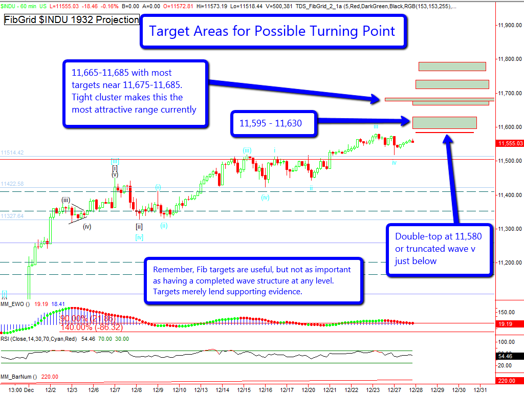 We continue to see the need of a new high. On Monday the DJIA gapped down and ran to just above the levels we cited as necessary to have us looking downward without a new high. As long as those levels stay intact, we’re going to continue looking upward. Not too far upward; once this last small push is done, it’s likely that we’ll be on the verge of a significant decline. Updated targets are presented in today’s full briefing.