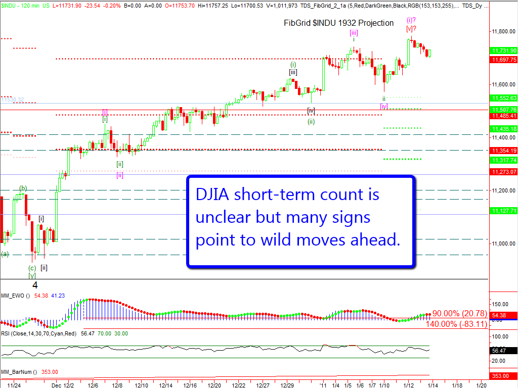 The short term counts in equities and equity futures are ambiguous even though the longer-term counts tell us that we should be topping in this region or slightly higher. While that makes it tough to pinpoint the exact spot of a turn, we see many signs that movements may start to become more wild. This is consistent with a topping process. We also know that in these regions those short-term moves become increasingly unpredictable. Therefore we want to be more cautious in trying to predict the very short-term moves while we still look to our cited confirmation levels to confirm a change in trend.