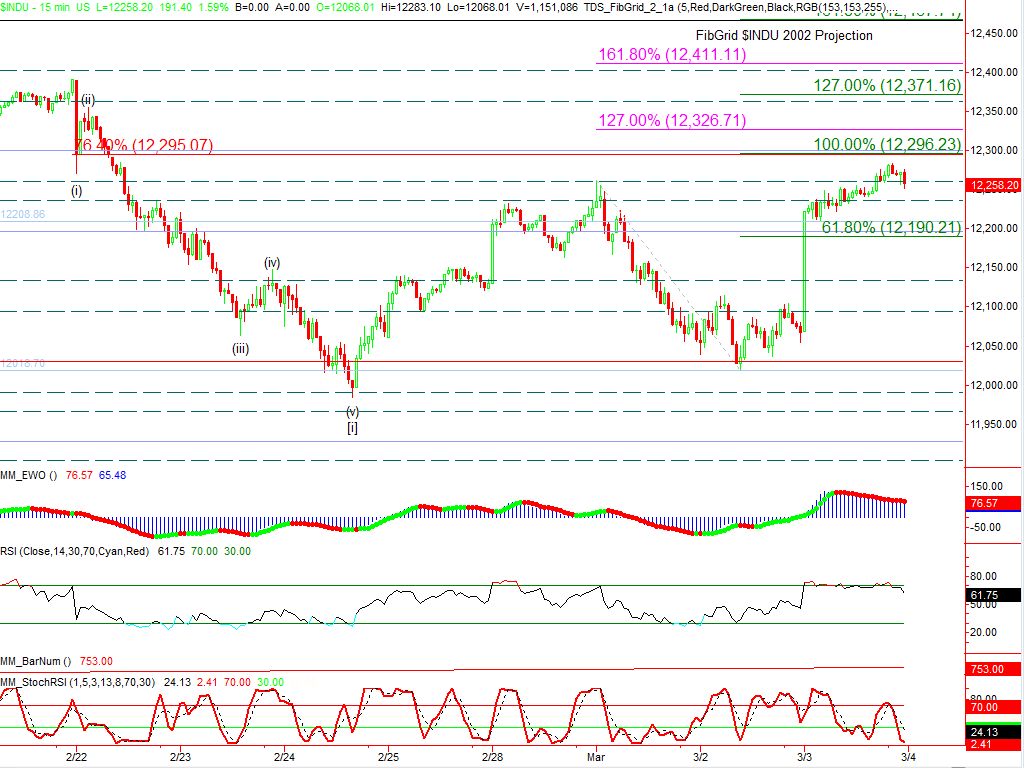 After a big up day on Thursday, U. S. equities are testing their February 18th highs and are forcing a decision since the short-term bearish case does not allow for prices to rise above this prior peak. In the DJIA, Thursday’s advance slowed as it reached the 76.4% retracement level and this may turn out to be a good target. However, any turn down from below the February high would suffice.