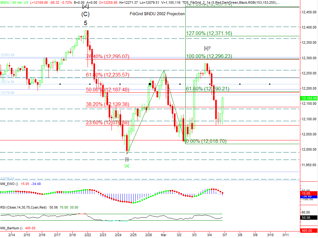 Friday’s drop in the DJIA gave the bears a chance to show that the wave count could still be interpreted as a negative. However, the last-hour pop almost reached levels that would put that count in question. If prices don’t see follow-through selling then the near-term direction will be in question. The most immediately bearish count for the YM also needs follow-through from here. So a push down from the open on Monday morning would be the best way for bears to seize control.