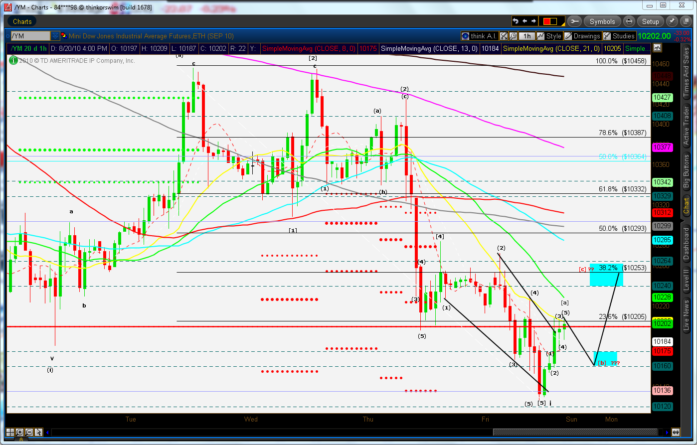 Looking ahead for the week, I expect that early on we will complete a wave ii correction. With the pullback on Friday afternoon, it appears we may have completed a 5 wave move back to the “Fireline” from where I would expect a 3 wave correction perhaps to the area I have marked near the Fib “Moguls”, and then a 5 wave move back above the “Fireline” to complete a Zig-Zag wave ii, near the 38% retracement area of wave i.