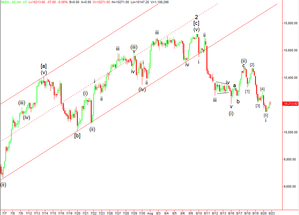 Friday’s fall removed any doubt that wave (ii) might be trying for some form of complex correction. Although by Thursday’s close the only reason to still suspect the possibility was the extremely deep wave [2] correction and the markets tendency to create confusing second wave action for over a year now. Friday’s action has left us with what appears to be a clear 5-wave movement down from the 10,719 high on August 19th. Seeing 5 waves down tells us that this is now the direction of trend. The hourly chart of the dow shows the five waves down in (i) as the dow fell out of the upward channel we had been tracking.