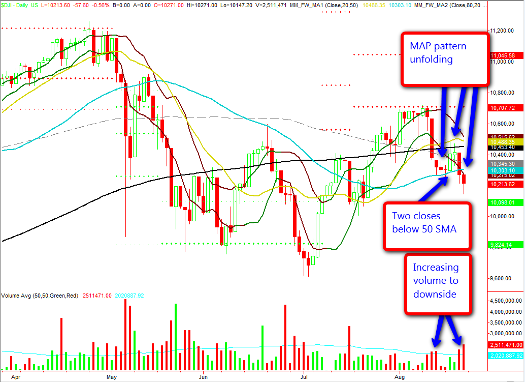 We are seeing some of the same indications from many of our other technical indicators and patterns. On a daily chart we can see that The Dow has had two closes below both the 50 SMA and MOBO. This is the penultimate step in a potential MAP pattern where it breaks below the 20SMA, bounces from the 50SMA to fail a retest of the 20. It has now broken the 50 as predicted and should retest the 50 before falling if the pattern completes. We are seeing an uptick in volume with red volume bars eclipsing green ones. Volume on Friday can be dismissed due to options expiration, but the chart shows this to be more than a one-day phenomenon.