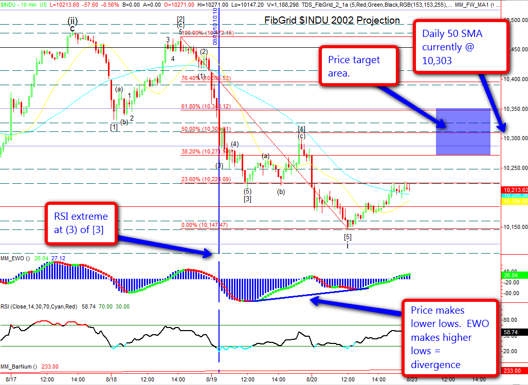 If price does complete the MAP pattern it would coincide with a reasonable target for the end of the wave ii that we are expecting from our Elliott Wave analysis. It is possible that wave ii at friday’s highs which would be near a 23.6% retracement level. This is a Fibonacci target, but a rare, shallow one. A 38.2% to 61.8% retrace would be more common. Within this range we also see the daily 50 SMA at 10.303 and FibGrid skyline at 10,287. Even more important than the levels is to spot a completed corrective wave structure. Levels will just serve to reinforce the likelihood of a complete wave ii if we can count the move complete at a predicted level. That’s exactly what we’ll be looking for during the early part of the week.
