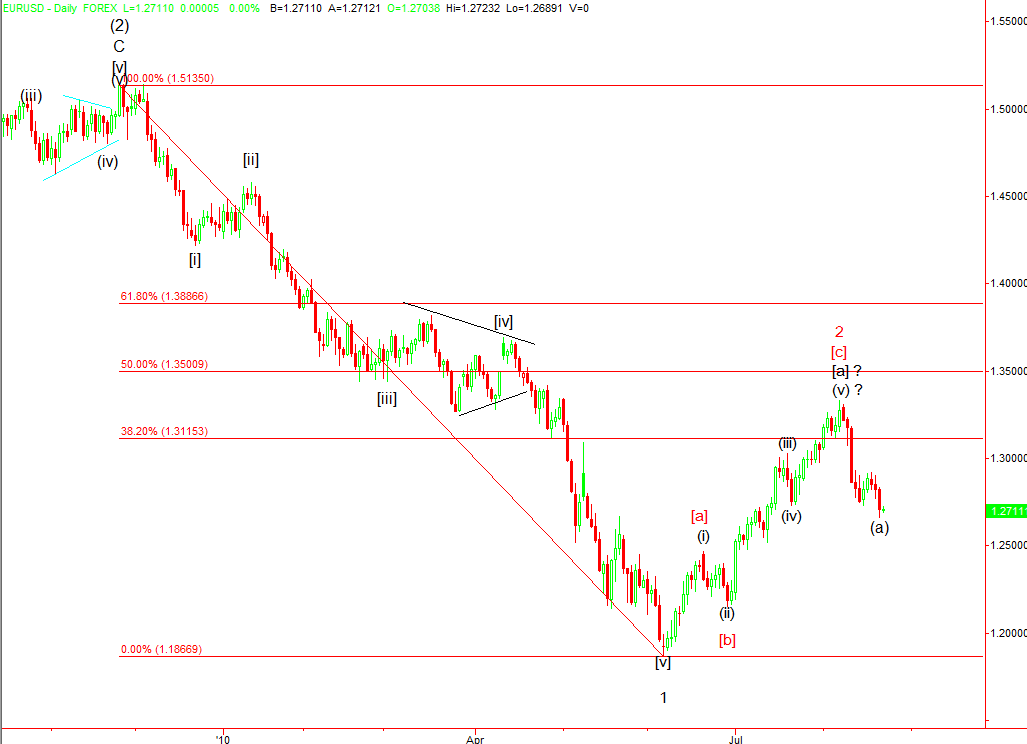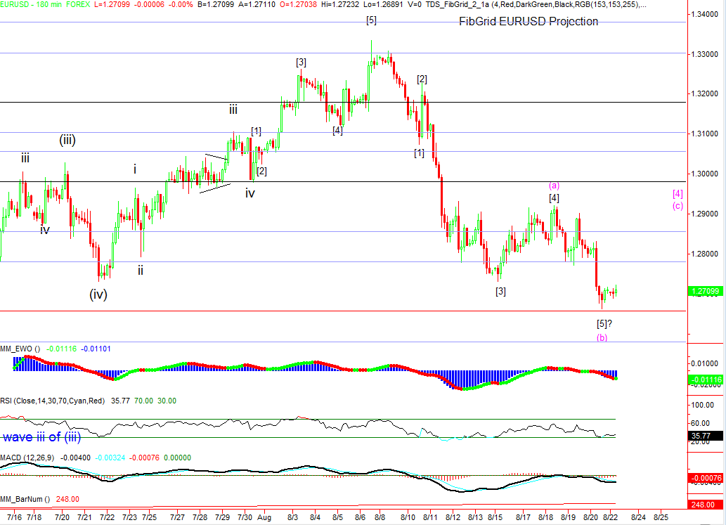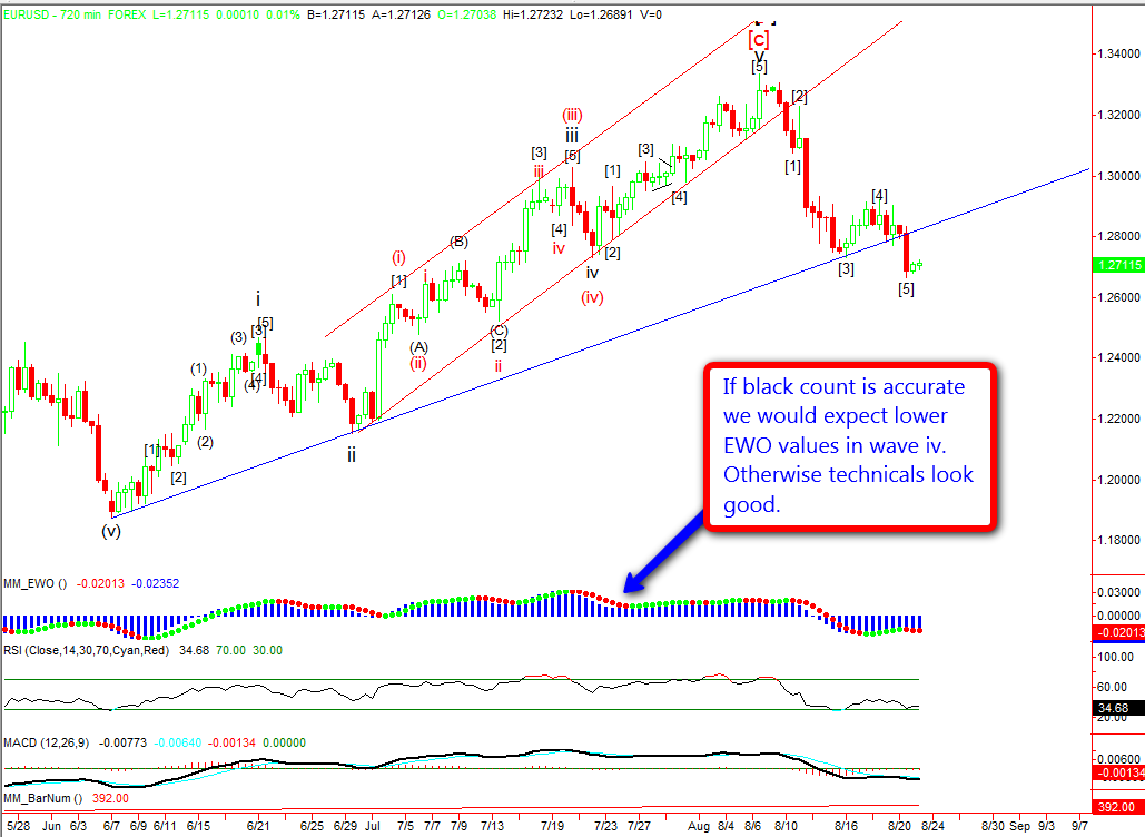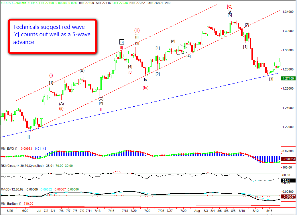 For the moment, the Euro looks like it will continue down. However, unlike U.S. equities, it’s unclear that it is yet ready to make new lows for the year. While that possibility might be in the cards as shown by the red count on our daily chart we want to remain aware of the black count’s suggestion that the current down move is just a [b] wave within an upward correction. The difficulty in determining which scenario is likely comes from our ability to count the rise from June lows as either a three-wave correction or a five-wave impulse move. While that doesn’t clear up the medium-term view, it does suggest that prices still need to continue lower, either to complete a downward correction for [b] under the black count, or to complete a five-wave move down for a red [i] as the start of a larger downward run. Both counts also suggest new lows in the longer term, the black count just needs to see a higher correction of wave 1 before making new lows.