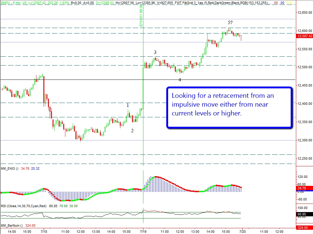 Overnight silver futures continued selling off and gold returned to test Tuesday afternoon lows.   Both display the characteristics of an impulsive decline with five waves clearly visible in the silver chart.   While it is premature to call a turn down in either metal, there is a strong case to be made that we are seeing a turn in silver.   Its rise from may lows is in three waves and can count complete.   If so, then we would expect to see it sell off to levels that are lower than those seen in May.  Elliott wave theory suggests that it has the potential to be a significant move.   While this isn’t one of the markets we cover for the newsletter we felt this would be a potentially useful observation for those of you counting waves on your own.