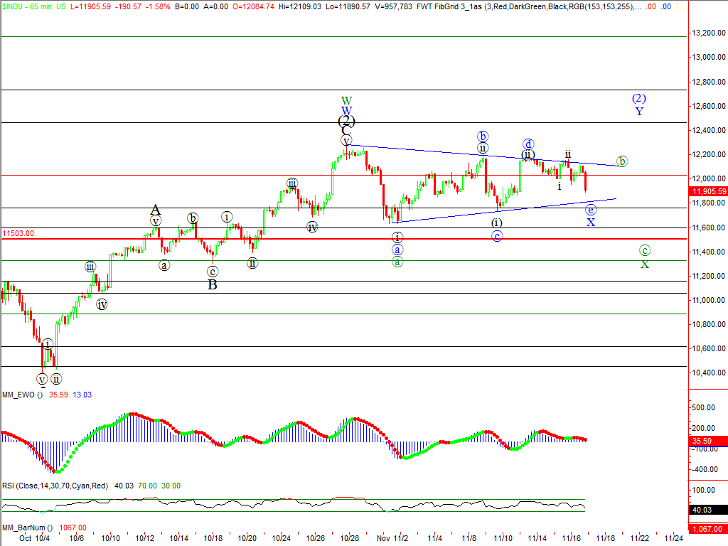 The 11,862 number cited in last night’s DJIA video is incorrect. The index would have to print below 11,737 in order to invalidate the triangle as it is currently drawn. Until we get a break below that level, a push to new highs, or some other clear indication that one of the various alternates is becoming more likely then we’re still stuck waiting for U. S. equities to reveal their intent.
