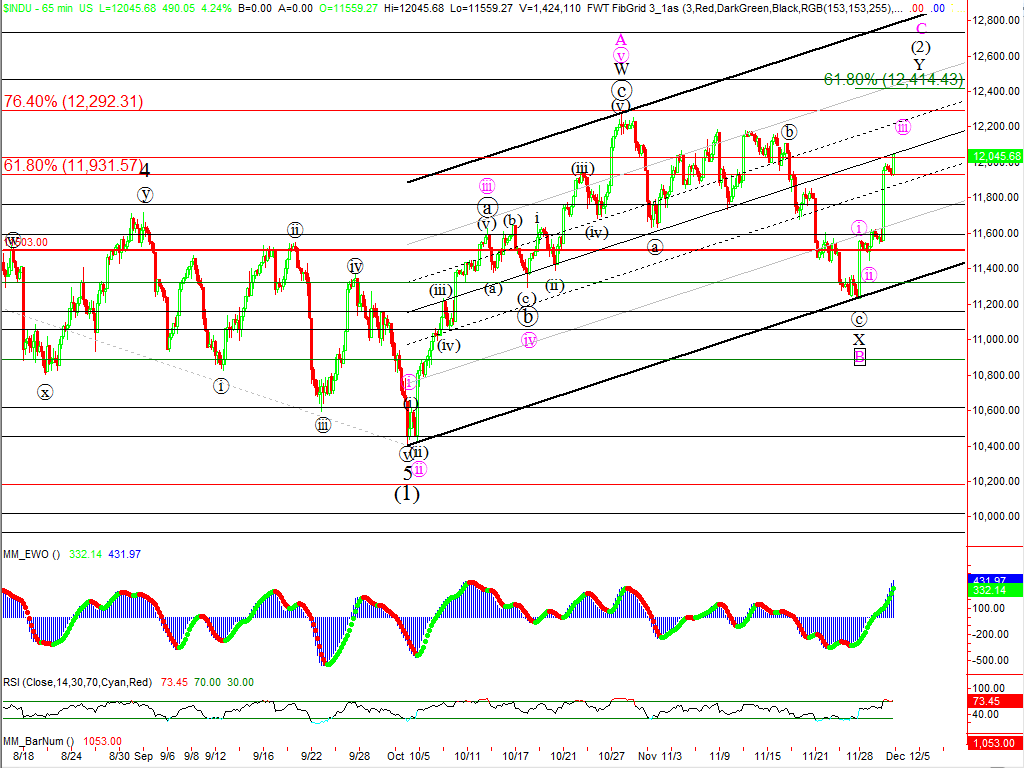 In the DJIA, a break below the magenta wave circle-ii label at 11,447 would have us consider that more likely a B wave low and reinforce the notion that the index could be heading lower without the need for a break above the October high.