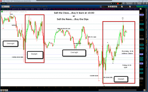This is a interesting phenomenen that we observed today and caused us to wonder what is driving the market. If you study the above chart you may wonder the same. We’ve displayed a 10 minute chart of the past two days. On it, we have place on the times of major reports announced during the pre-market and overnight hours.