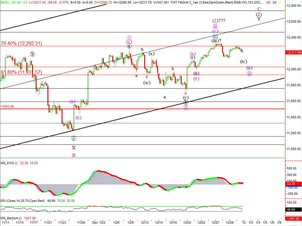 This morning’s higher open in the Dow futures is almost right to the level where prices would likely turn under several possible counts. Similarly, some of the DJIA counts we’re tracking would need to turn from levels that would be suggested by the YM early morning high.