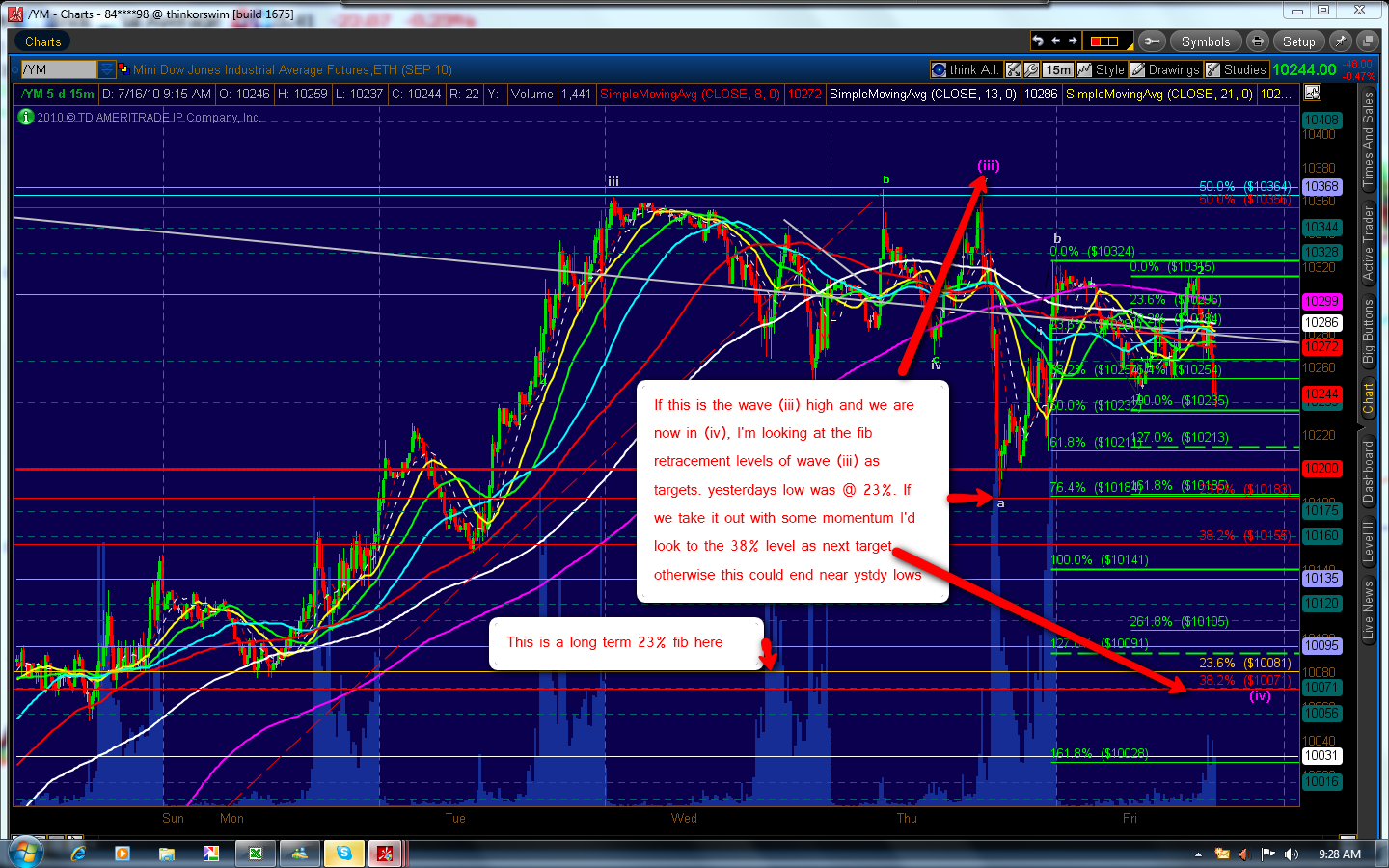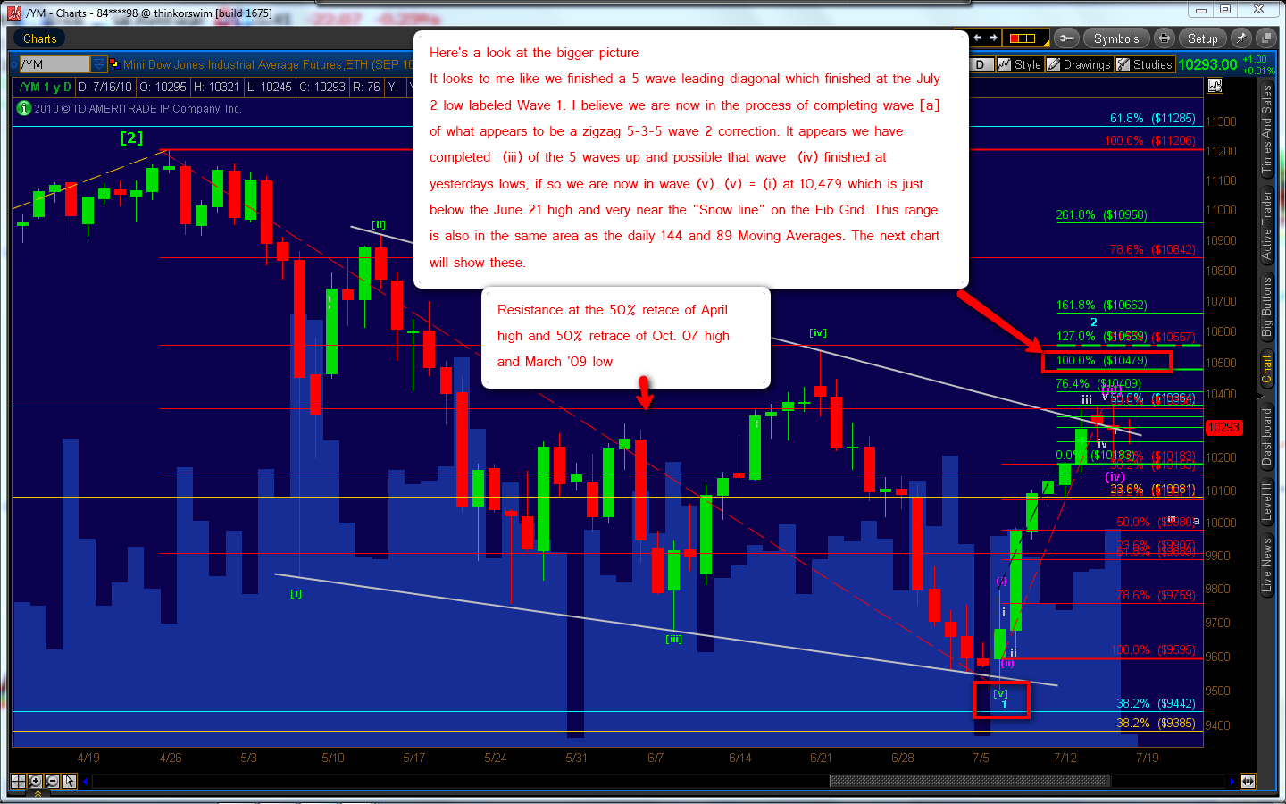 This count labels the wave (iii) highs at the overnite highs of Wed. at 10,365. This level is also a 5o% retracement level of the Oct 07 highs as well as the 50% retracement levels from the April 26 high..interesting how a combination of fibs coincide to provide important price levels support and resistance. If this count is correct we are now in wave (iv) of [a]. An important price level to look for is at a 38% retracement of (iii) at 10,0071. Since lots of volatility occurs on Opex days, we will watch for a strong move up from near this level. If so, this could lead us to finish wave (v) where I would be looking at the “snowline” which is just short of the June 21 high at 10,536 which I have labeled as wave[iv].