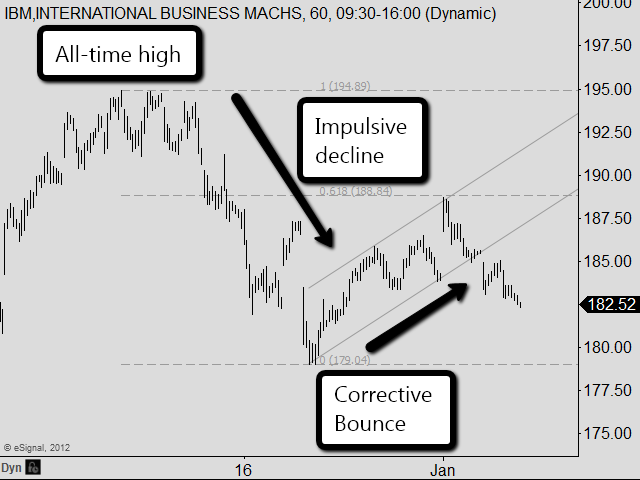 The pattern in IBM also supports the idea of lower prices and so we are comfortable positioned short through a long put position opened on Thursday. We find the setup for continued downward movement from the all-time high compelling for several reasons: