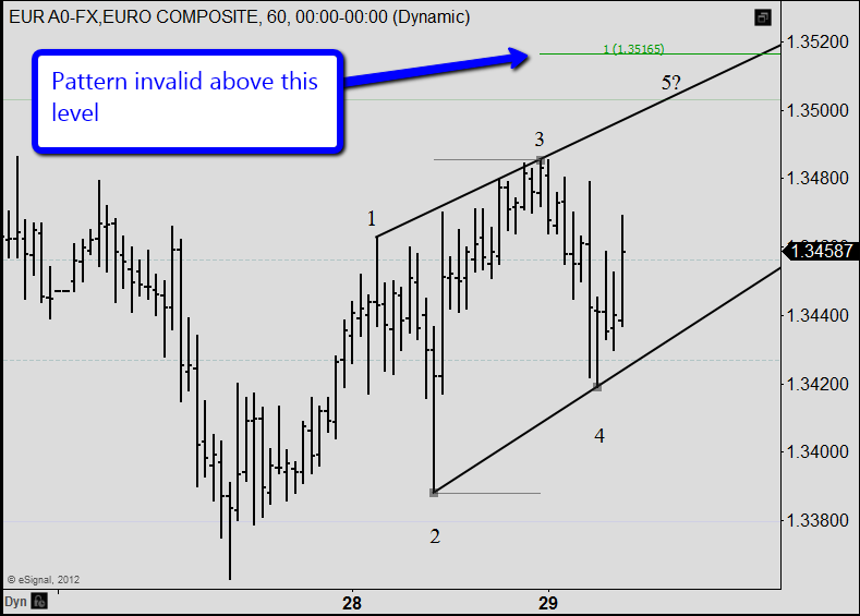 We are on the lookout for an upcoming opportunity to short the Euro against the U. S. Dollar.   The setup is similar to the one we used to support our entry in RL, a possible ending diagonal.  If this pattern is unfolding as shown in our hourly chart then the setup would come on a move above the point where we have our wave 3 label.   The trade is wrong where wave 5 would be longer than wave 3 at 1.3516.