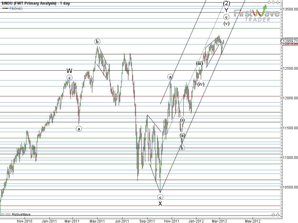 On Monday, the DJIA closed just under 100 points off the late February high. As of this writing at about 8:00 Eastern, futures are at a level which would a cash open back above 13,000 and within striking distance of the prior high. This has been a possibility we have been considering as the decline from the February high remains in three waves.