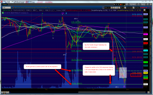 Pre-market I said look at the prior days low to watch for either a bounce there or guage the momentum. Look at the big red candle in the chart. Lot’s of momo there, it didn’t even pause and continued on down to the 38% retracement that I had noted as the next target. It reached that level and paused for a couple hours developing into a wave iv barrier triangle (P50 EWP) and then continued on down to complete wave v at the lows of the days where it found the fib grid snow line and bounced.