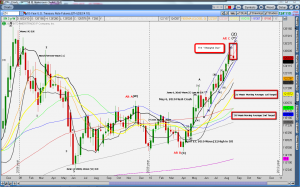 In addition to the wave count on the weekly you will notice the placement of the Shanghai Duo relative to the Mobo bands (the black channel). The past two weeks the final thrust in bonds has  taken the candles above the bands with clear separation. We have obseved this pattern on many time frames and the results we have observed in the past indicate a high probablility that price will eventually meet the 55 SMA. A David Elliott MAP pattern places the first target at the 21 SMA  and then get a bounce to the lower MOBO Band then turn lower to meet up with the 55 SMA.