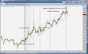 In addition, we have been making comaparisons this week to the apparent lag between turns in the equities market and the bonds. Reviewing this lag time as we have also indicated on the chart,the high in bonds just happens to be a Fibonacci 89 days from the April 23 wave [2] high in the Dow Jones. Time is probably the most elusive relationship to Elliott Wave counts to have any significant guidlines, however, we have frequently seen fibonacci relationships within wave counts and time, so we thought we would point that out.