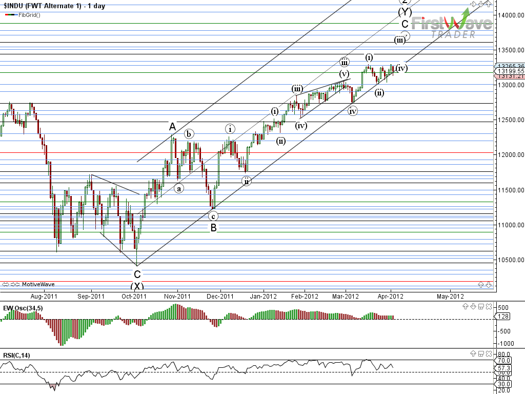 Today’s DJIA and Euro briefings contain similar theme.  In both we want to see breaks of certain levels to enhance the likelihood of an important change in trend; coincidentally, both levels happen to be right at FibGrid snow lines.  The collection of tools in our Elliott wave framework give us three ways to identify changes in trend: