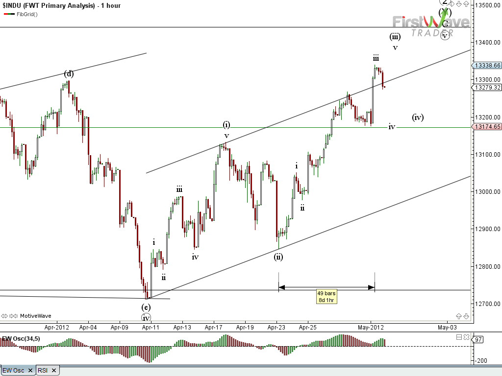 This has helped to take a little wind of the sails of U. S. equity futures which sold off a bit more overnight, adding to Tuesday’s late day decline which gave back a decent portion of the day’s gains. However, it will take much more significant selling from here to clearly show that the wave patterns are now ready for a bearish resolution. While we can identify scenarios where prices could turn down from near current levels, Tuesday’s new high in the DJIA also paints the picture for scenarios which need to see higher prices before a turn.