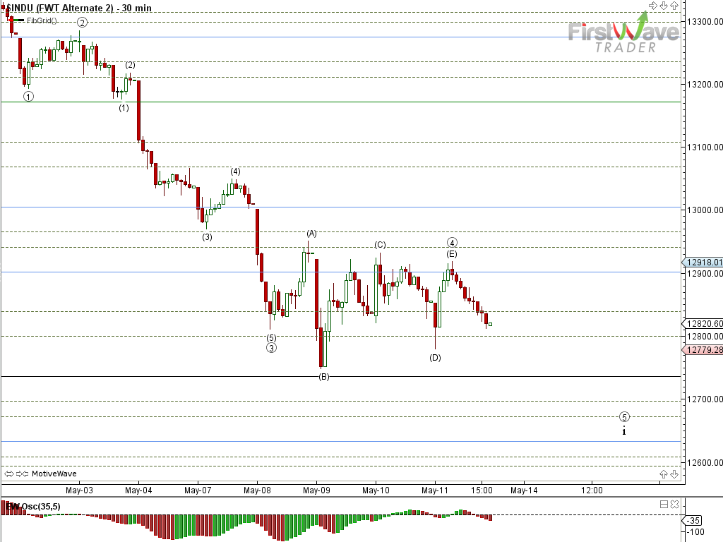 Nevertheless, a change in trend is what we are expecting and we expect this move down to complete in five waves. With divergences, the possibility of a fourth wave triangle, and nearby FibGrid levels for support, it is possible that we see a turn sometime soon. Remember, however, we won’t know for sure until the bounce starts so this is a place to remain cautious and nimble.