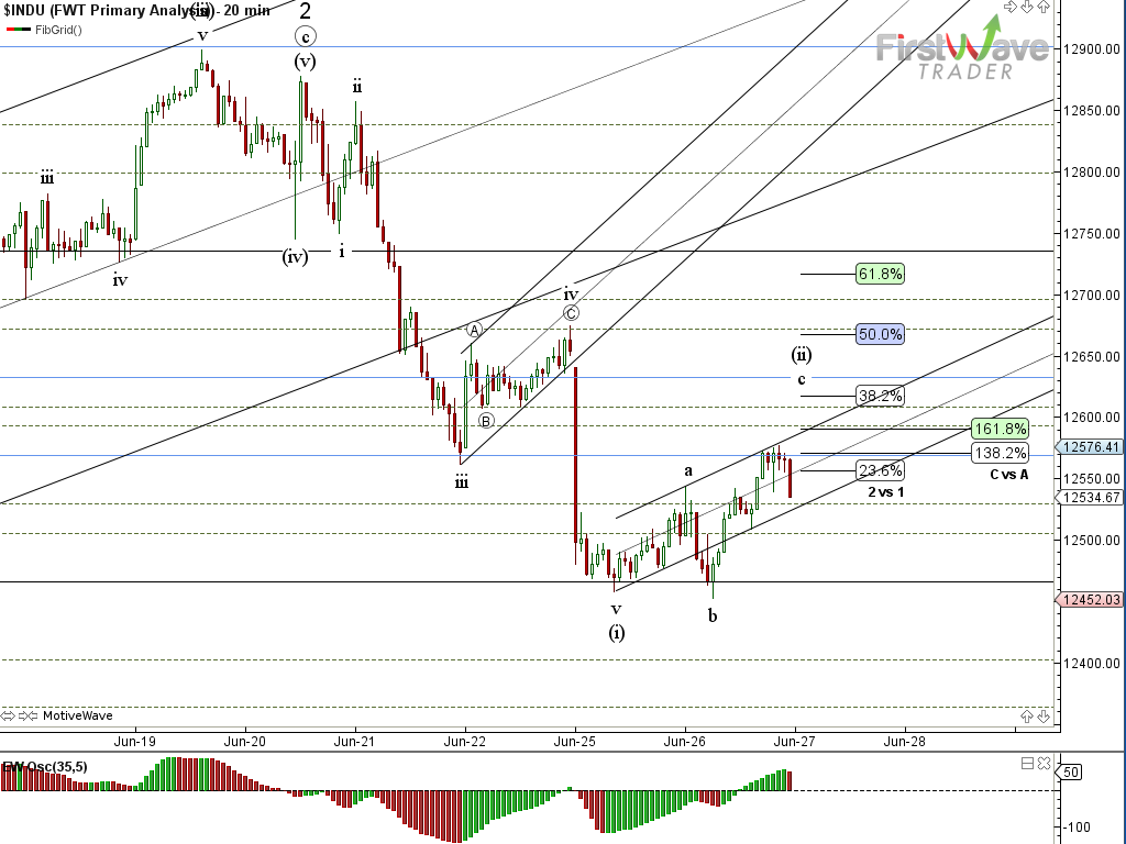 To make this concrete with examples, we can look at the YM snow line at 12,511. If the Dow futures build support above this level then it suggests that any correction may be a larger degree move and might not be finished. If the level continues to serve as resistance then it sets the stage for a move down. There isn’t a clear support level that would cleanly tell us that we’re done correcting, but an impulsive-looking decline from nearby snow line resistance would be strongly suggestive.