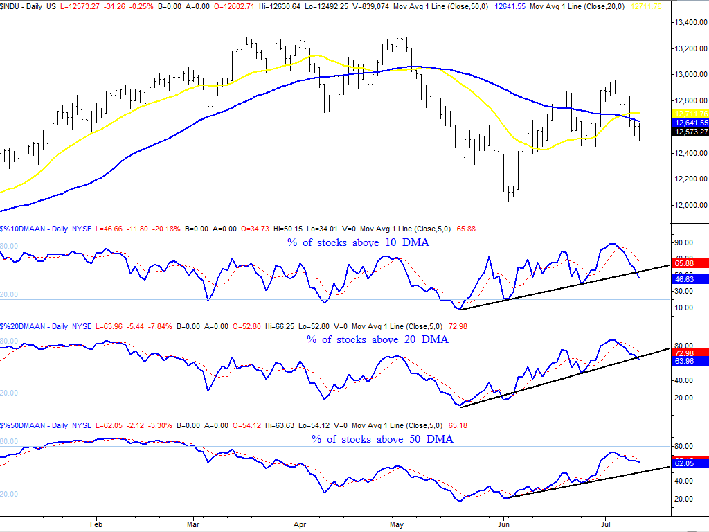 Simply substitute “Thursday” for “Wednesday” and the comments apply equally well to either day. It remains possible that we get yet another rerun today with yet another push closer to the important 12,450 level in the Dow and then yet another afternoon recovery, but sooner or later the market will need to move up or down far enough to tip its hand. Once again we’ve updated our videos with the latest indications that we’re waiting for. We want to be ready once the market finally signals its intent.