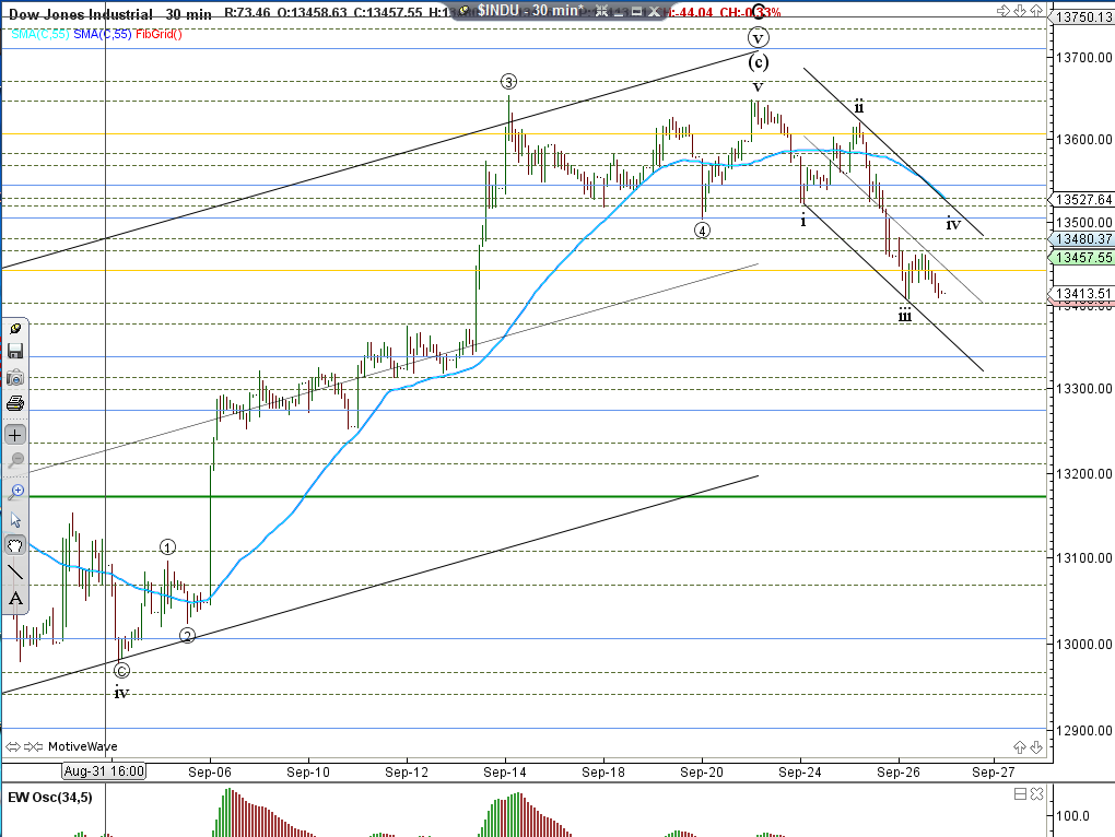 It didn’t take long on Wednesday for the DJIA to start to demonstrate behavior which begins to look more consistent with impulsive movement to the downside. We already knew in advance that this is what we needed to see to seriously consider the already-topped scenario alongside the corrective scenario. So at this point it deserves serious consideration.