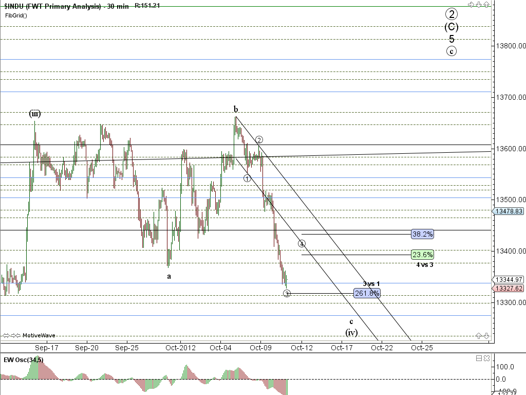 Once five waves down complete and we get our first bounce we’ll be able to tell whether the trend has turned down or not. It is possible that we’re preparing for that bounce now; we can count five waves down into the FibGrid treeline in the Dow futures. It is also possible in the DJIA, but equally likely that we’ve only seen three of five down.