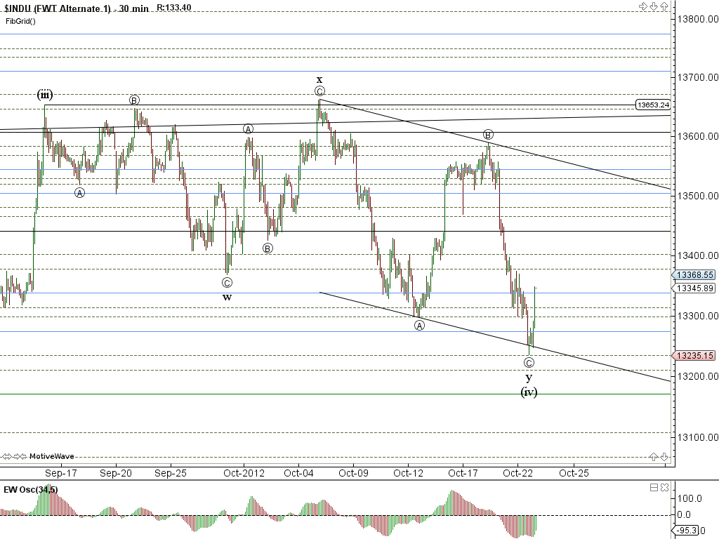 This morning futures have given up their late day surge from Monday and then some. What looked less likely in our DJIA video Monday night looks more likely this morning. That is, the expanded flat fourth wave possibility may end up being the plan if this move down is merely part of a correction. If so, we would expect to see the FibGrid treeline area offer some support. The alternative is that a larger downside move is materializing. A clean break below the treeline would be the first sign that the larger decline might be in play.