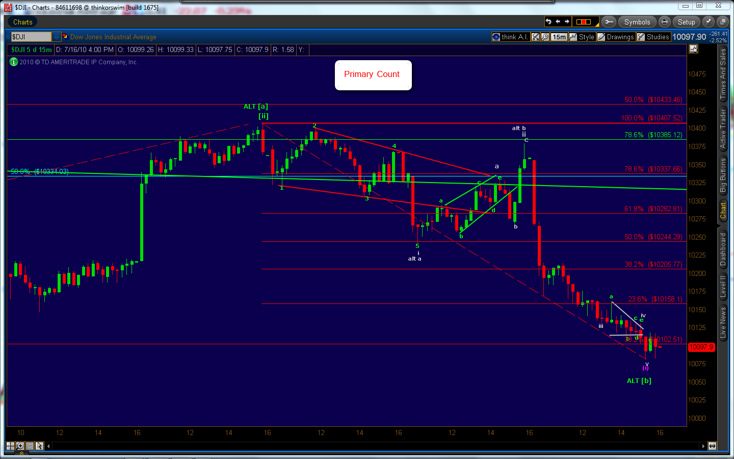 We finished the day Friday with what appears to be a complete 5 waves down labeled as Minuette wave (i). If this count is correct, from here I would anticipate that we have a correction of this structure as an a-b-c wave (ii). Since this is a “First Wave” down from the highs at 10,407 a normal second wave would correct a minimum of 38% which is at 10,205. The primary rule to identify a “First Wave” is that it cannot exceed the high.Most often we find a second wave correction in the 50%-61.8% area. If the high at 10,407 is exceed then the alternate counts shown in the next chart would become my primary count.