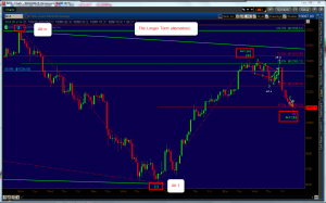 The above chart shows the alternate count which would indicate that Minor wave 1 did not complete until the July 2nd low at 9714. The implication of this count is that the Thursday high was the completion of Minute wave [a] and we perhaps just finished Minor wave [b] at just beyond a 38% retracement of [a].This is a level we have often observed in a b wave correction, so at this juncture it is important to the downside that we do not take out the Thursday high at 10,407. If in the next couple of days this high is exceed then in all probability the alternate count is in place and the market would go on to test the April 26th high. Based on our current projection the first target I would look for is the 78.6% retracement level of the April high to July low which is at 10,906.